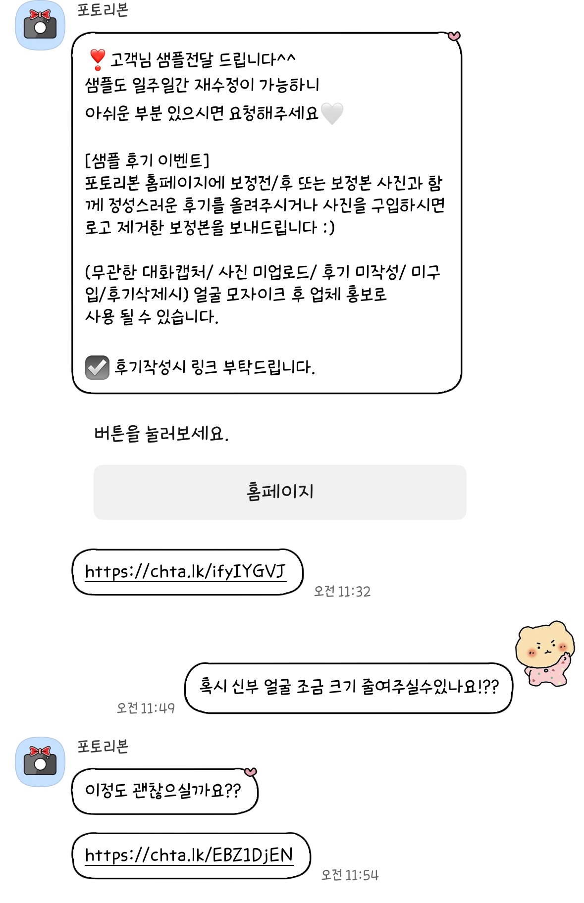 샘플이라고 해서 솔찍히 대충 해주는 곳도 많고 원하는 요청을 세세히 들어주는 곳이 드문데 포토리본은 자세히 요구사항을 들어주셨고 샘플임에도 불구하고 일주일동안은 재수정이 가능하다는 메리트까지 있었어요